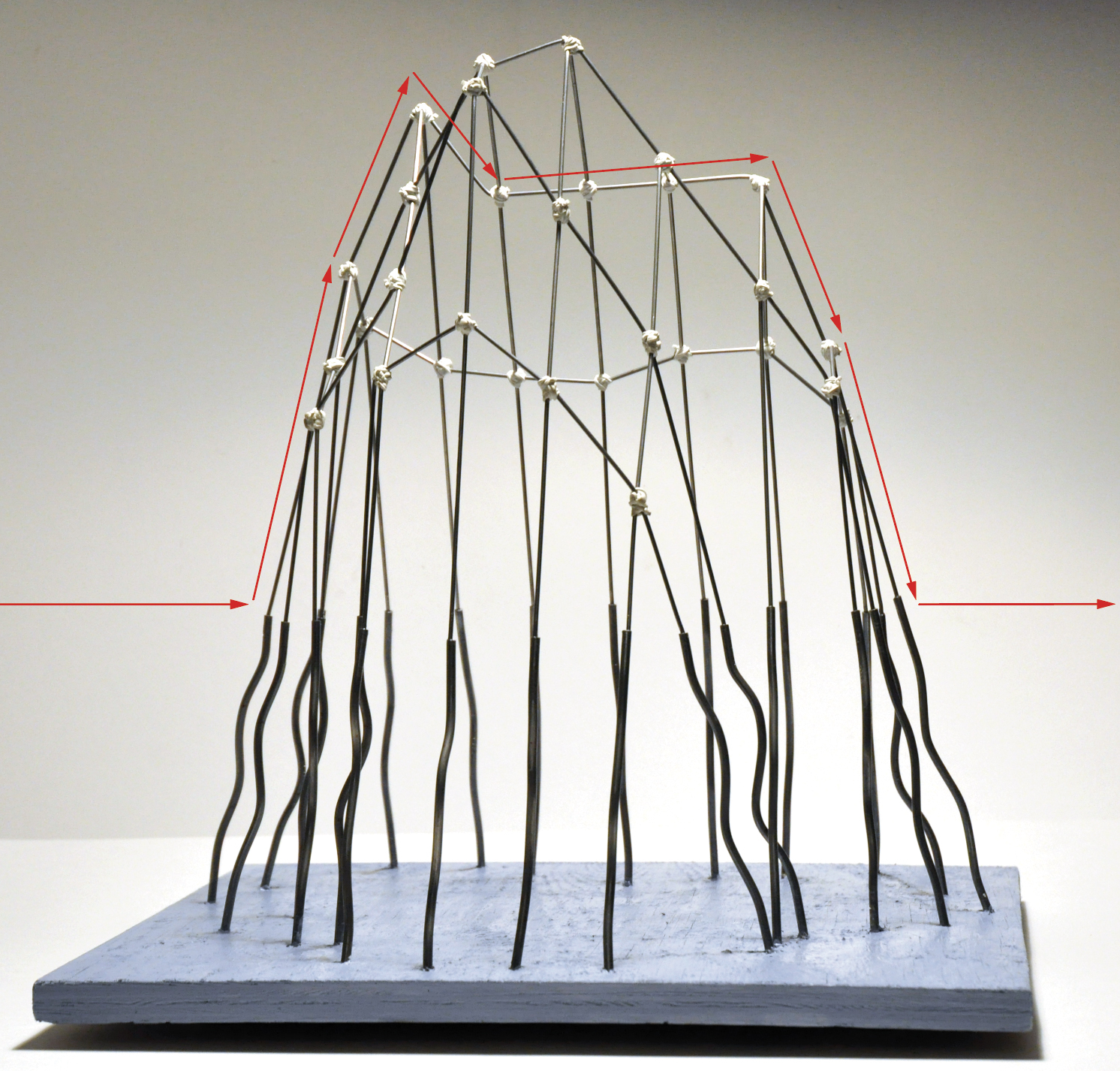 I first construct a 2-mm iron wire model using my 30 datasets to test my theory of a physical representation of the outcrop. The individual data sets indicate where the two meridians must cross and at what height. I raise the model of the shape of the island on 24 thicker threads that continue the direction of the lower parts of the model with an elongated sine curve that imitates the wave shape of the sea. This will be the base of the sculpture.