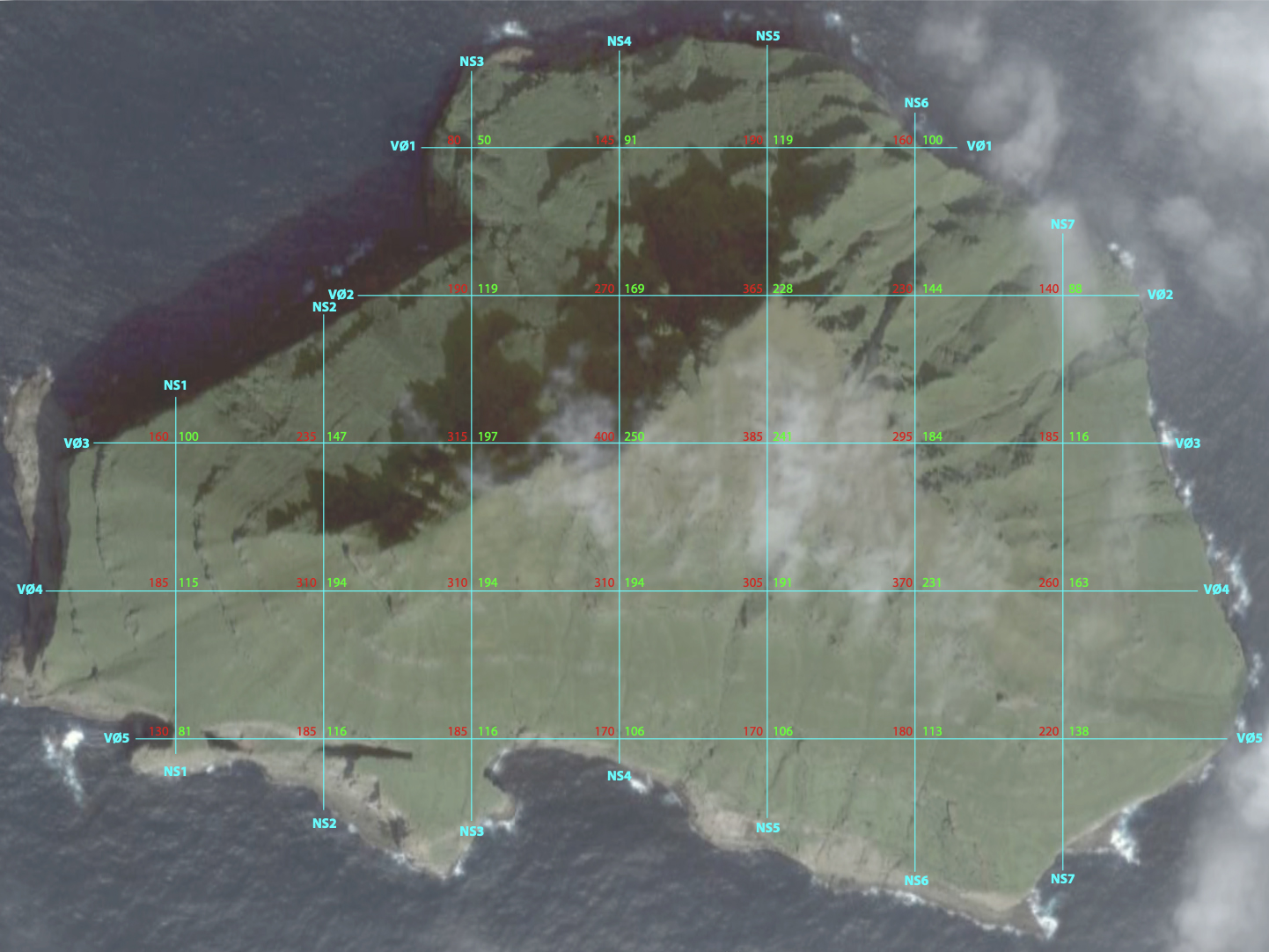 7On the maps, the cartographer has drawn the meridians north-south and east-west. The lines are fictions added in order to place the island's data on the two-dimensional plane. I place my own fictitious square grid of latitude and longitude over the surface of the landscape on a aerial projection of the island. I record the heights of the island where the lines cross. The coordinates of the square grid and the associated elevations, thirty sets of three numbers, give an idea of the shape of the island. This method is only a rough representation of the physical conditions.